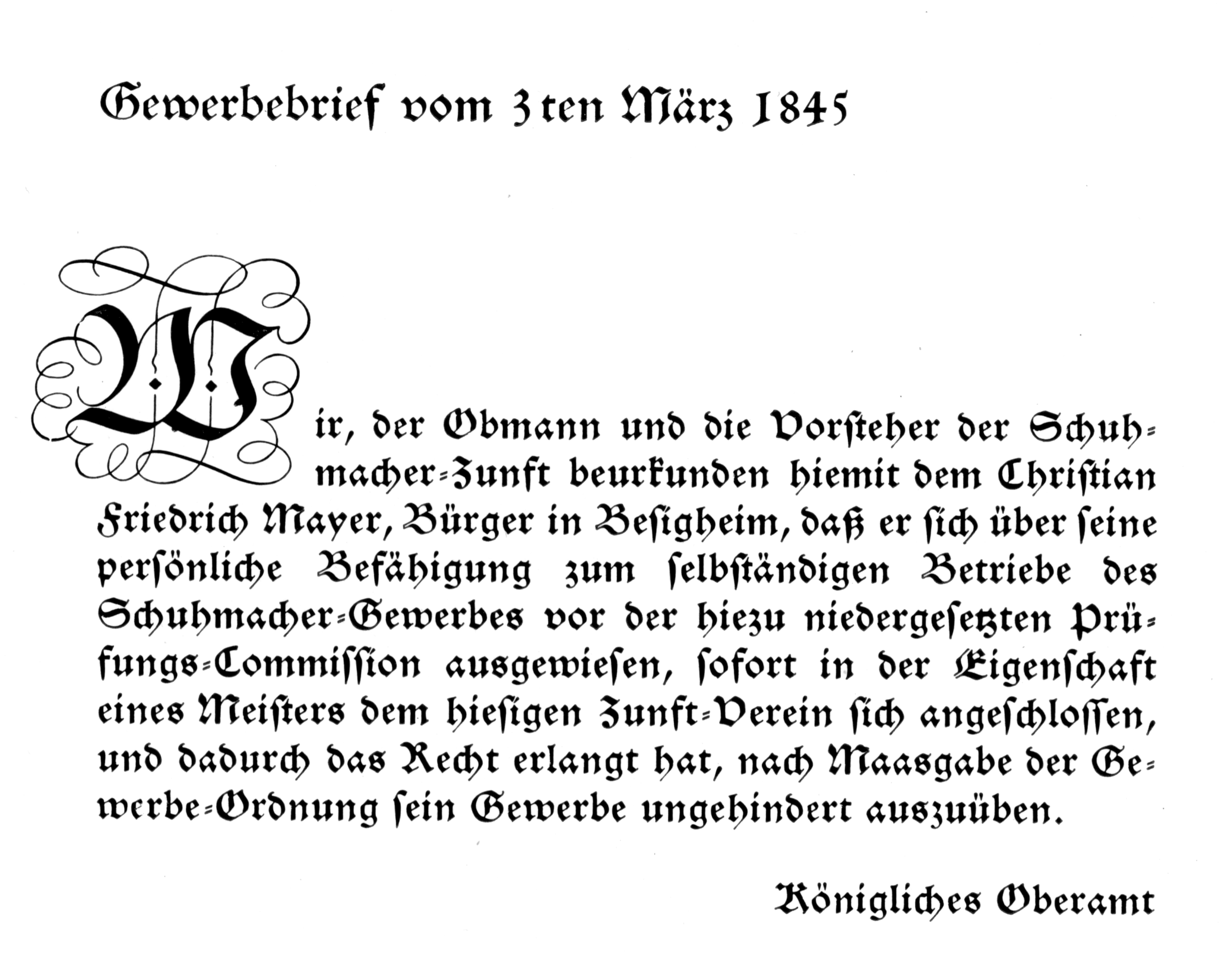 Die Wurzeln von Ulrike und Charlotte Mayer gründen in einem der ältesten, inhabergeführten Schuhgeschäfte Deutschlands. Die Eltern, Helmut und Elvira Mayer, haben Ihre Schuhgeschäfte mit insgesamt vier Filialen in der fünften Generation mit Leib und Seele geführt. Das älteste historische Dokument ist eine Kopie eines vom Königlichen Oberamt ausgestellten Gewerbebriefs, in dem Christian Friedrich Mayer im Jahr 1845 die Befähigung ausgesprochen wurde, das Schuhmacher-Gewerbe ungehindert ausüben zu dürfen.